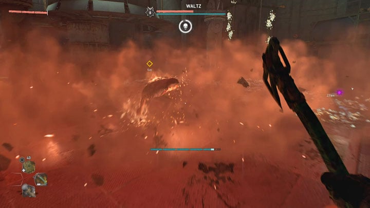 This phase of the fight puts your parkour skills to the test. You must rely on the environment ( bars, yellow ledges) to reach the platforms Waltz awaits at. Prioritize precise jumps and gripping onto objects.