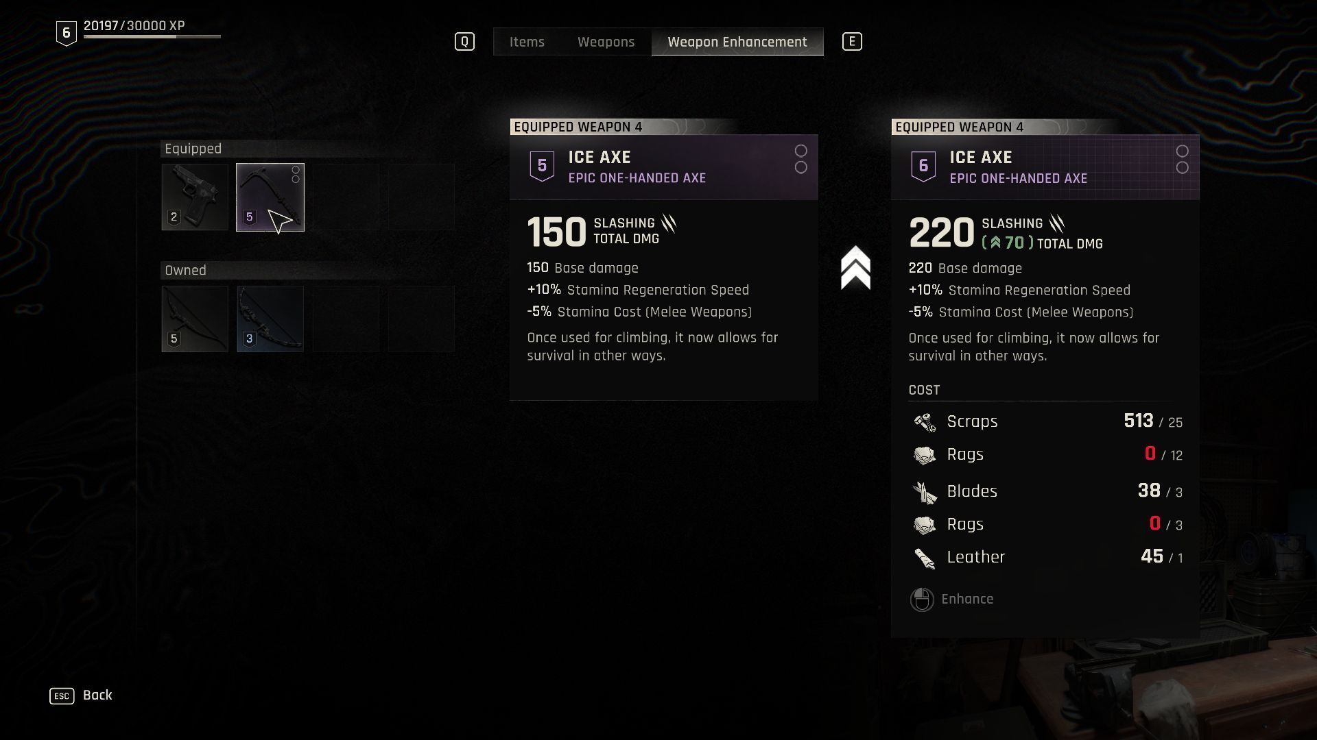 To upgrade a weapon, you will need a workbench. There, select the Weapon Enhancement tab, then hover over the one whose statistics you want to increase. Of course, you will need the appropriate materials for this.