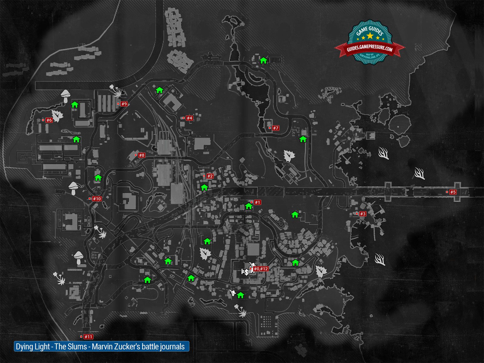 On the map above, you can see the location of the Marvin Zucker's Battle Journals that can be found in Slums. You can use Survivor Sense to locate them, but it is not necessary. Read the description under every point to learn how many secrets can be found in a given place and where to look for the Journals.