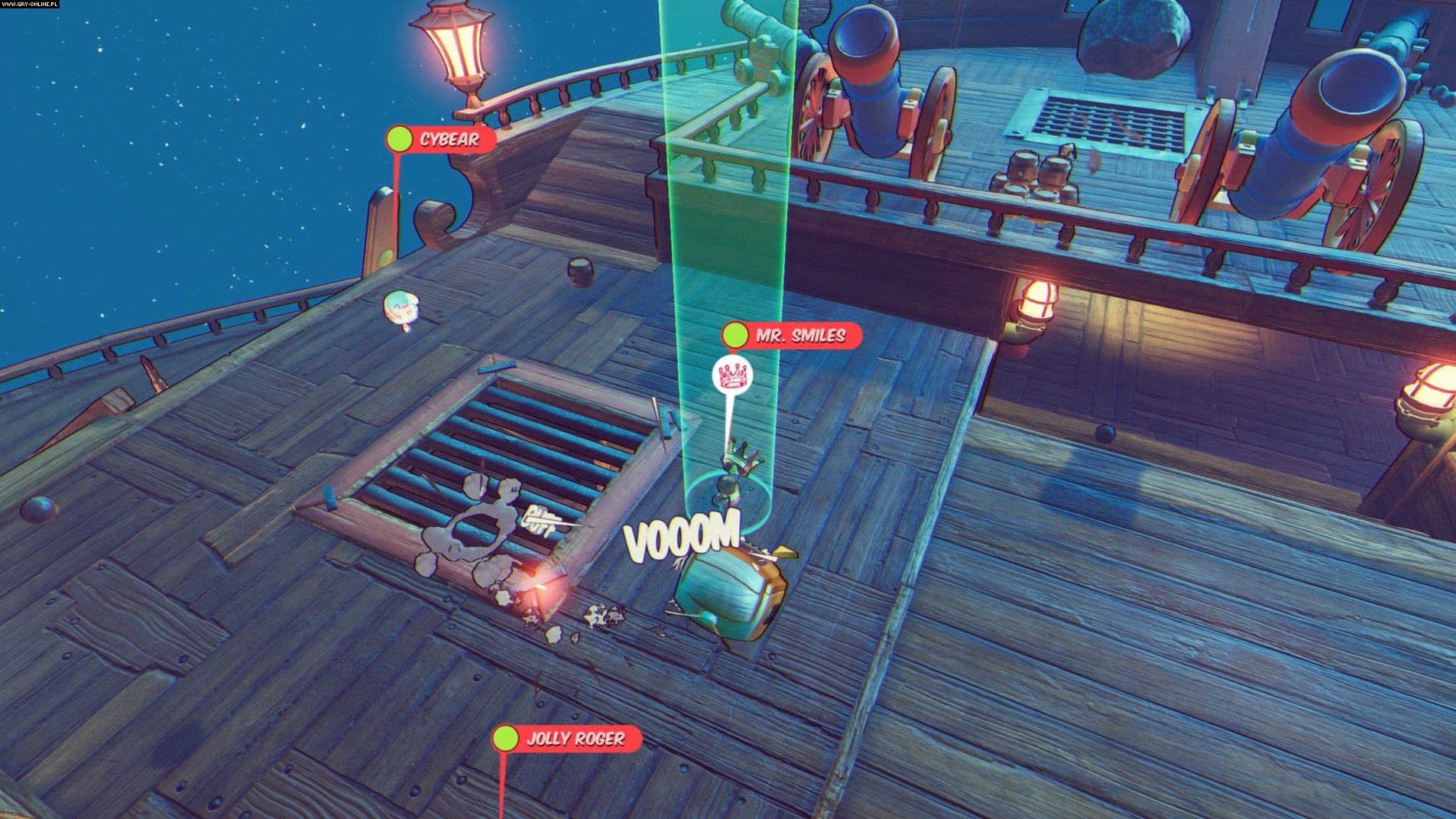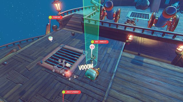 We can play as a mech/robot able to pull other players and stun them, a Teddy bear that can attack with its big belly, a dizzying and fast toy car, a voodoo doll that can convert enemy players into frogs, or an explosive chicken. Now, imagine this unusual set of figures being release into one of the playgrounds and given one goal: to behead other players. Obviously, the only possible result will be one big, fun, colorful, and exciting mayhem. Add to this grenades scattered around the map, trapdoors, retractable spikes, lasers, or other traps, and you will get a more or less clear picture of what MisBits might look like. As a side note, remember the tip: the large green cucumbers you find on the board are OP.