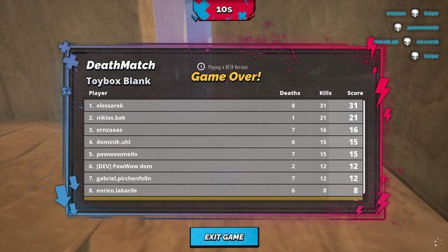 In the closed beta of MisBits, we were able to test the game in three modes. The classic deathmatch, interesting 2v2 KickBrawl (vide Rocket League, but with heads and toys instead of cars) and ToyHunters (a supertoy spawns somewhere on the board, and players try to catch it). The developers also shared some interesting maps – each of which is the embodiment of one, sometimes pretty off-beat, idea for gameplay.