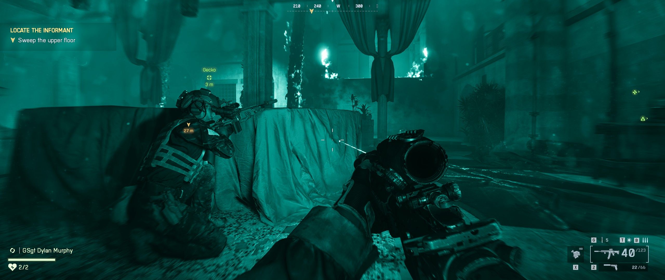 But a poor storyline could still be overlooked. The most interesting part is that the storyline campaign blatantly copies the latest Call of Duty: Modern Warfare titles. We've got more than just the usual corridor shooter setup here, where you go from one scripted event to the next, with the usual chases and shooting from a vehicle. There's even one mission in an open area where, thankfully, you can choose the order of shootouts. There's this mission where you have to slowly and strategically move through a bunch of rooms, just like in Clean House from Modern Warfare 2019. You've got NVG goggles, and the choice of main characters is even more surprising. Among them is a mature woman pulling the strings at the top, an honorable and brave bearded man, and... a guy who hides his face under a mask most of the time! Sounds familiar?