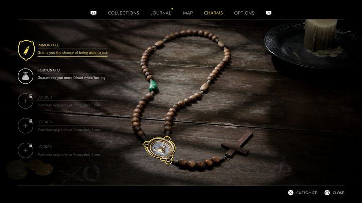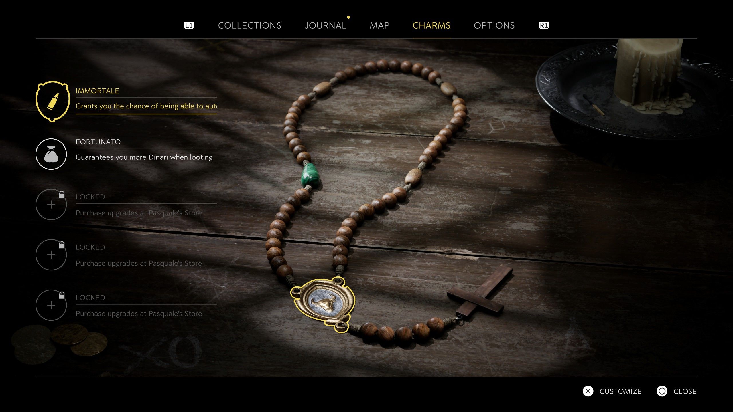 Another unique gameplay feature is the rosary, which adds an interesting layer of strategy. It lets you gain certain advantages—like finding extra ammo for a specific weapon type or silencing Enzo’s footsteps to give you an edge while sneaking. It works like this: during missions, you’ll find beads that can be attached to the rosary, each granting a specific bonus. You can also upgrade the rosary itself, unlocking more slots for additional beads. It’s a really cool addition that lets you tailor your playstyle a bit. Sure, it’s not super deep or complex, but it’s still a thoughtful and welcome mechanic.