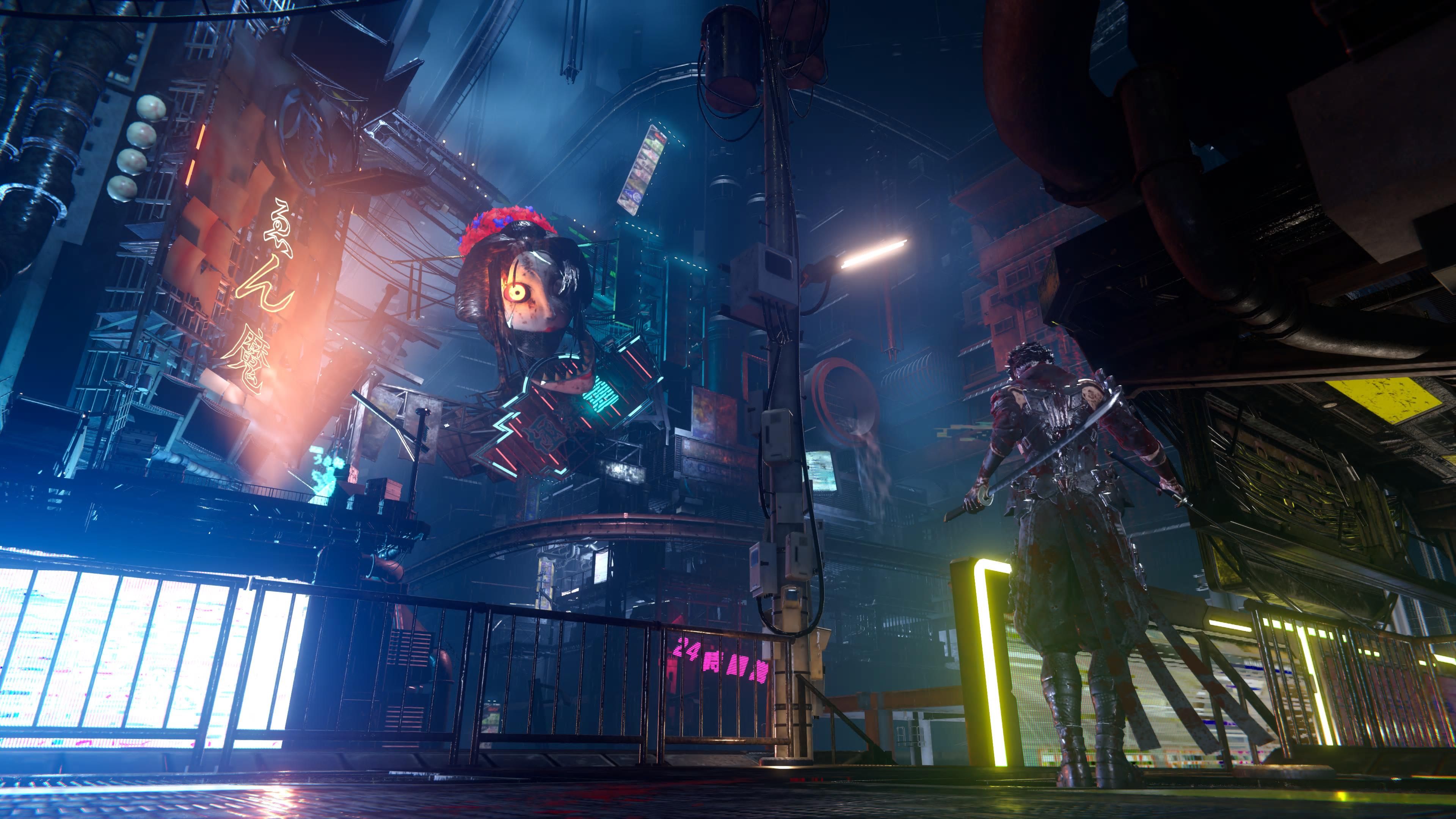 Nevertheless, if we accept a different pace of gameplay and some automated elements, the combat itself can still provide a lot of fun. I'm super grateful that this is an old-school slasher—straightforward and not overcomplicated. It's all about non-stop enemy slaying, with some cool pipe grinding, quick skill challenges, or detours to find hidden Torii gates with extra challenges. It's a brutal, dynamic action game that allows for strong expression of your style through the aforementioned array of weapons and combos.