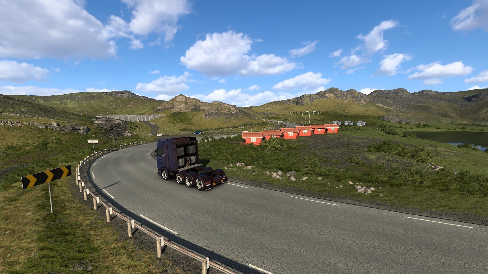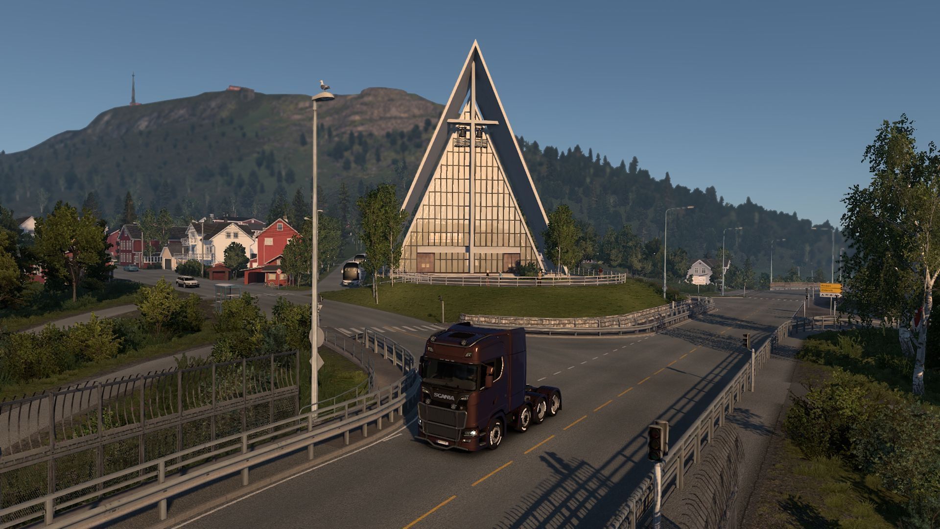 Here we encounter long stretches of narrow roads, often leading through mountain peaks. There are also tunnels, but they aren't as numerous. However, this expansion is not about infrastructure. Nordic Horizons is one of the most spectacular DLCs in the series. Almost every turn offers stunning views of mountains and lakes seen from the peaks where the roads are. Here and there, you can also come across small villages filled with traditional Nordic houses with steep roofs. Speaking of architecture, it's impossible to miss examples of contemporary buildings – for instance, one of the photography challenge points is the Arctic Cathedral in Tromso, built in 1965, designed by Jan Inge Hovig.