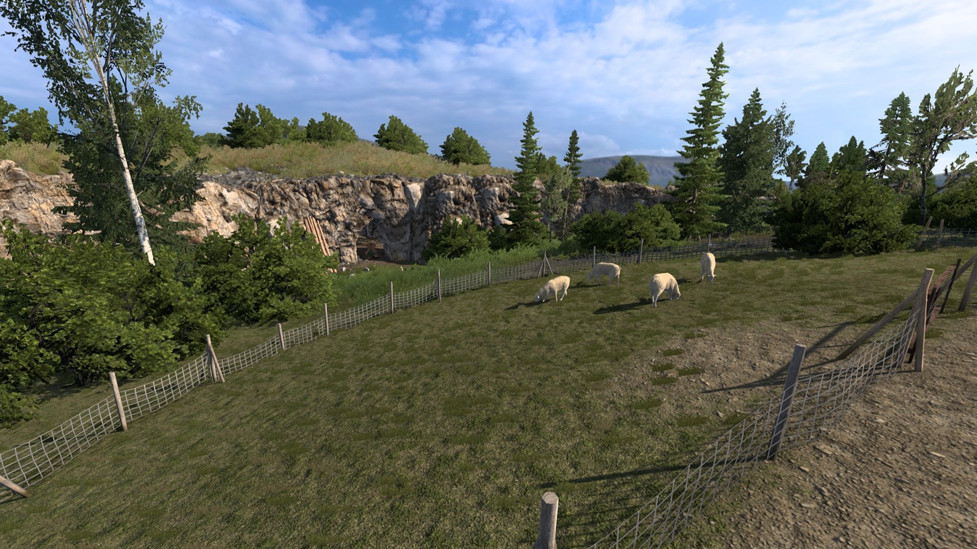 The map also has hidden secrets. Near the town of Dombas, between rest points, you can turn onto an unmarked gravel road. About halfway, you'll encounter a small pasture with sheep, and if you look closely, you'll spot a troll from Scandinavian folklore in a cave. The exact location on the map is 1068.55;107.364;-64764.8;-0.13788;-0.265288.
