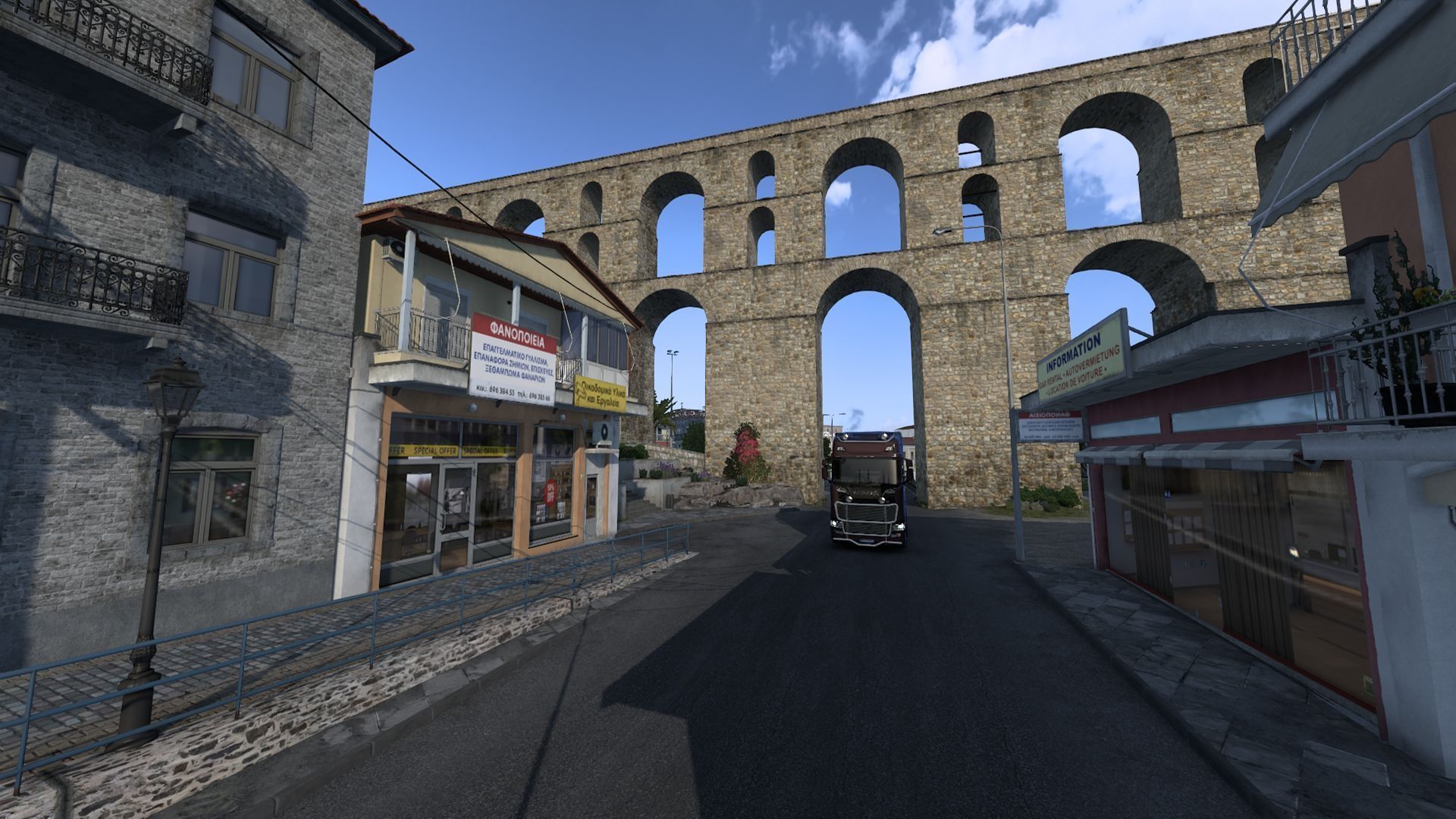 Additionally, you can find at least two hidden routes. One can be found in Kavala – discovering it will not only allow you to drive under the aqueduct and enjoy the views but also shorten the route between the western entrance to the city and the port. Head to the coordinates 58438.9;13.927;52470.1;-1.36655;0.0104734 to find it. Meanwhile, when driving from Heraklion to the city of Chania, you can at some point turn right onto a road not marked on the map. Thanks to this shortcut to the port you won't have to drive around the island. The downside is that there is a 40 km/h speed limit and frequent traffic jams.