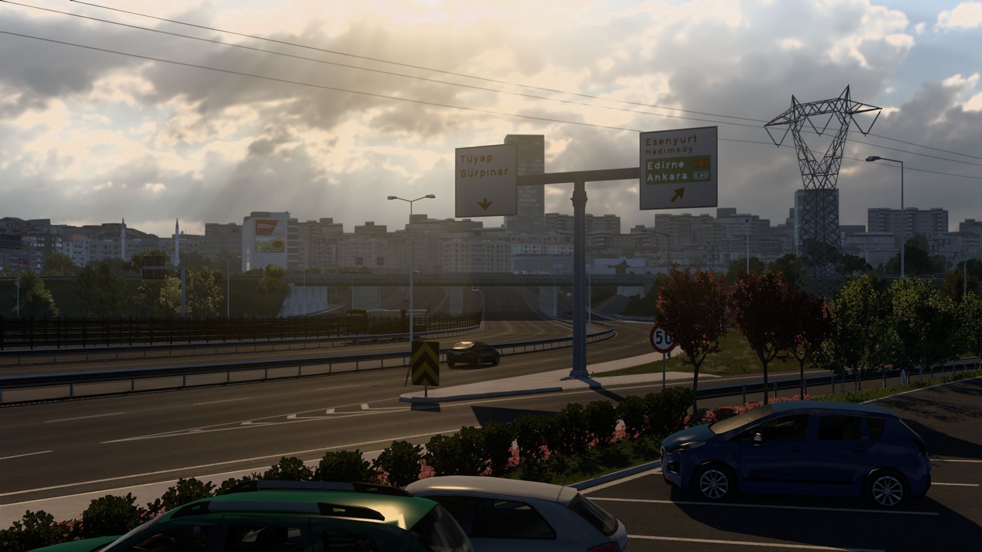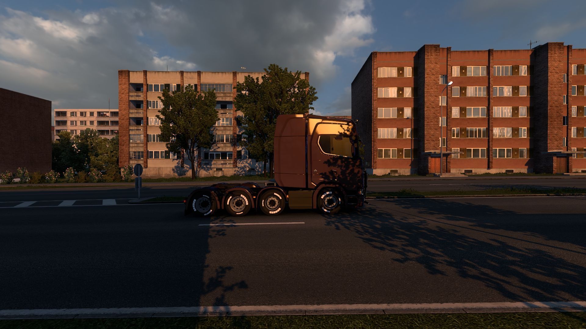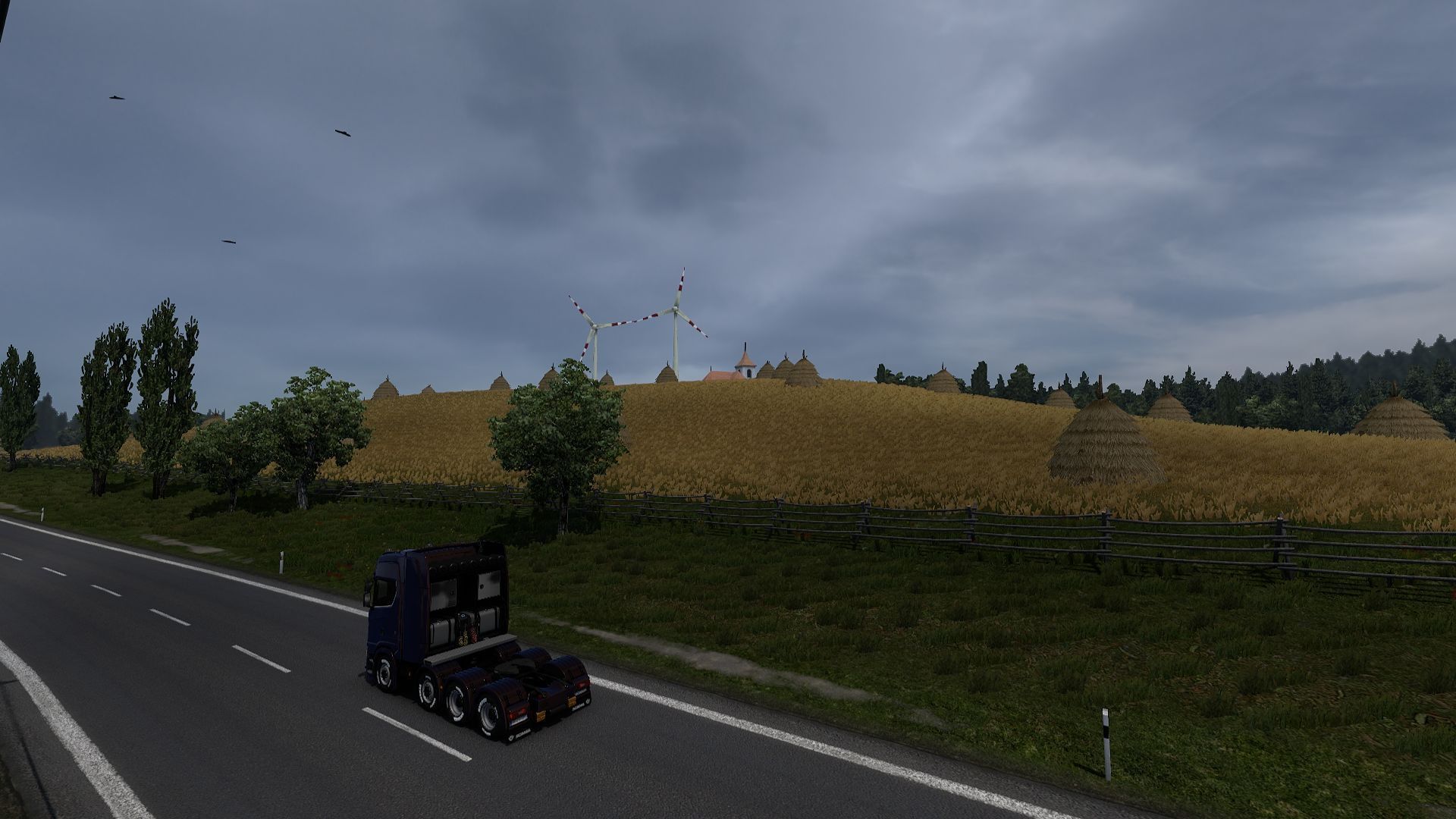 This is one of the expansions focused on landscapes. On the new map, we traverse the Carpathians, navigating narrow mountain serpentine roads, such as those between the cities of Brasov and Iasi. Additionally, we pass through mysterious Transylvania and the more exotic Thrace. Most of the route consists of narrow roads surrounded by fields, although urban roads are also available. You can experience the local architecture by entering one of the unmarked roads on the map in the specific town (its coordinates on the map are 43011.8;53.2381;43109;0.738293;-0.024433). It will lead you through a very narrow street with buildings characteristic of the less representative parts of Romanian cities. The expansion also includes modern highways, especially around the capital of Turkey, which is almost entirely composed of wide, multi-lane roads.