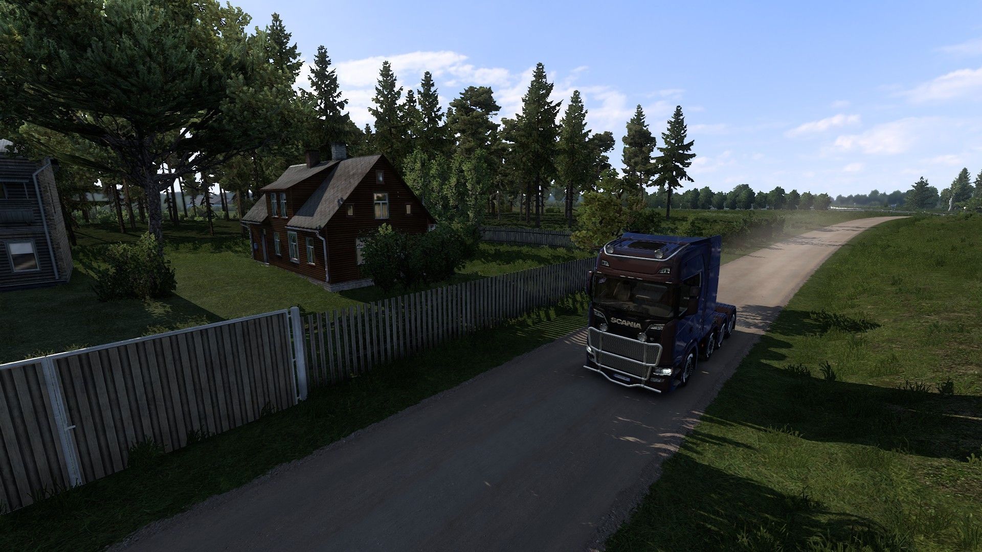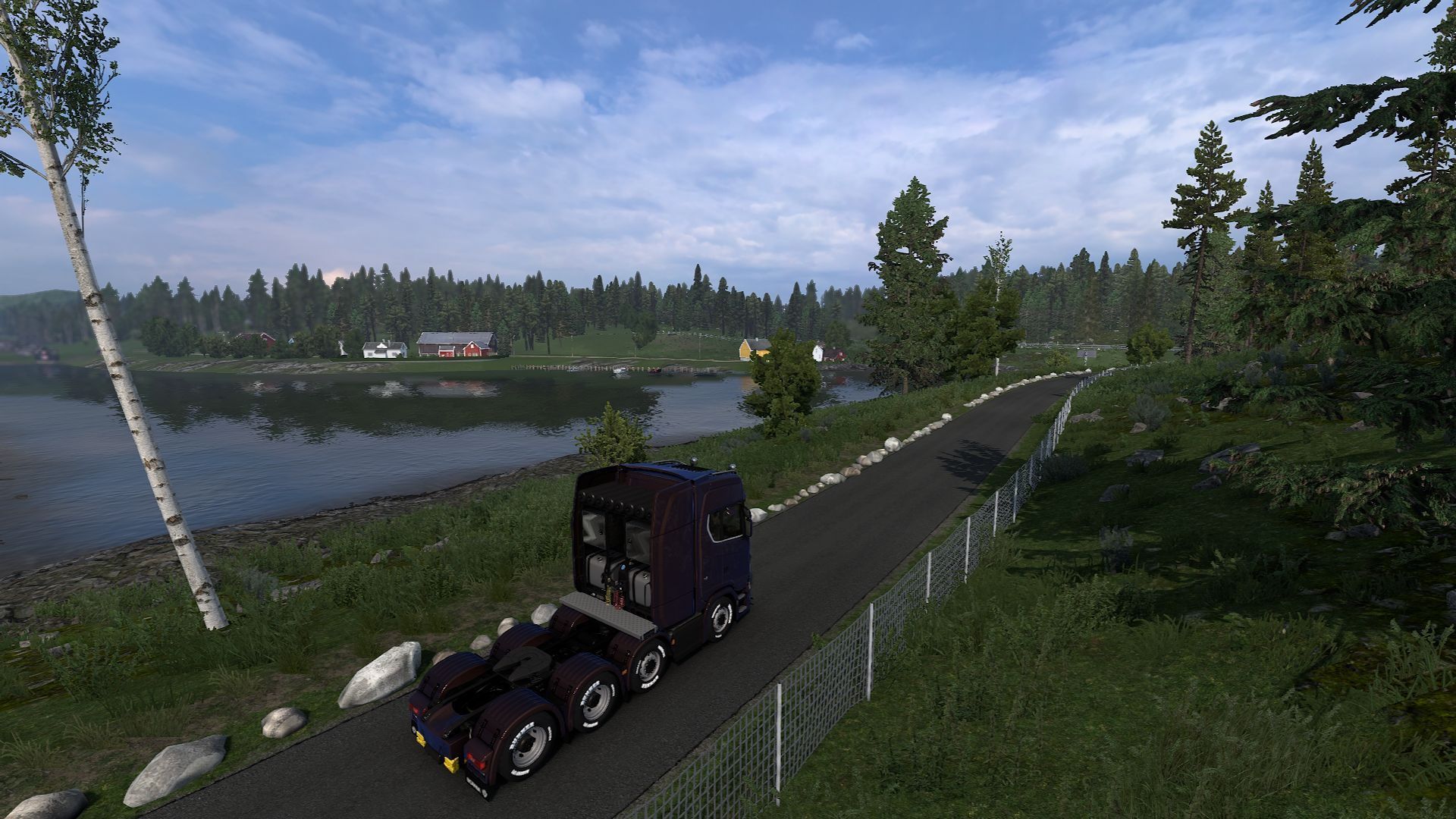 The Scandinavia expansion also features idyllic views. For example, thanks to a hidden road between the center of Kristiansand and the AgroNord company (you can find it on the map at coordinates -7031.43;32.3306;-42978.1;0.483427;-0.172786), you can drive by a small lake surrounded by charming houses done in a typical Nordic style. The road is quite long and it branches out, but the second section runs parallel to the main route and doesn't offer additional attractions.
