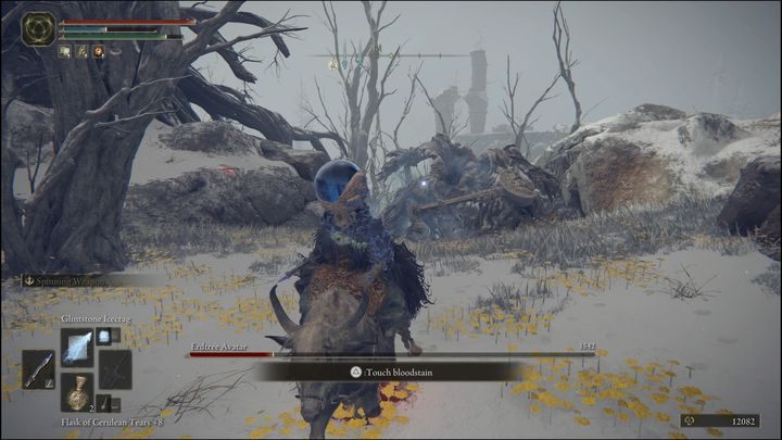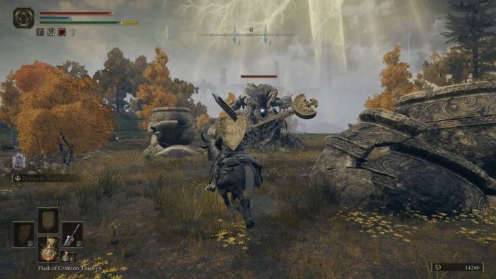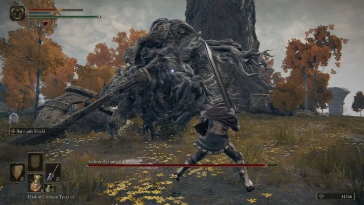 Erdtree Avatars are best dealt with while on horseback. As a result, have a supply of Rowa Rasins in order to be able to heal Torrent. Set a hotkey for this item and use it if necessary. Before the battle starts, learn the layout of the arena, so you're not get blocked on a obstacle. Your biggest concern during horseback combat is the large range of the boss's staff swing. The rest of the boss's attacks are not that dangerous, or are easy to avoid by dashing.