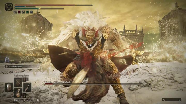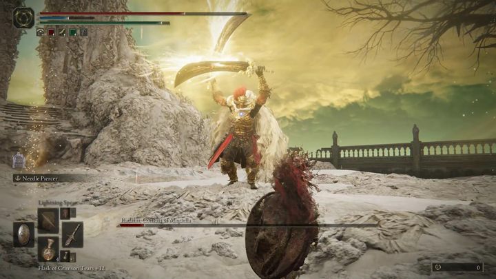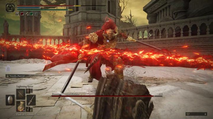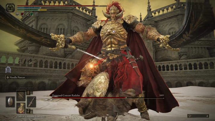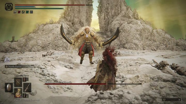 The fight with Radahn is long and extremely demanding - get ready for many trials. However, the first phase of the fight is not overly difficult. Use this phase to learn the boss's moves - most of the attacks in the second phase are very similar to those in the first. If you want to win, you must learn the first phase almost to perfection, being able to complete it without using many healing flasks.