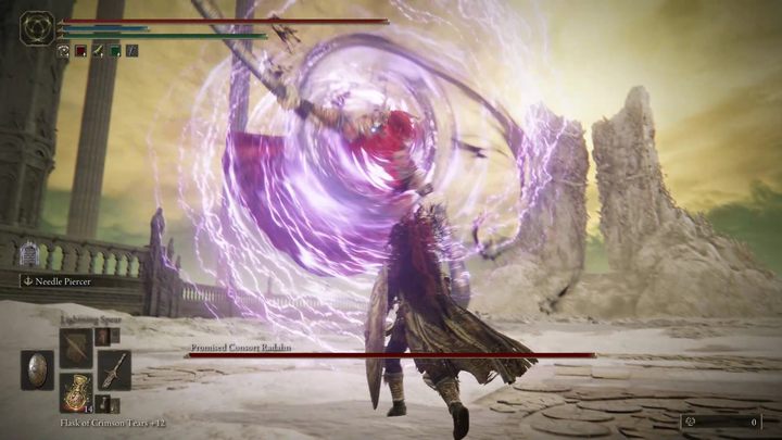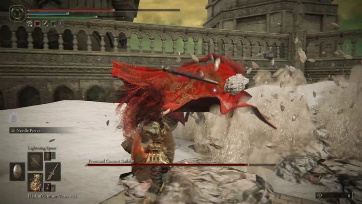 Radahn attacks with long combinations of slashes that deal physical damage - you can block them with a shield. Some of his slashes are performed with both swords at once - you can also block these, but they will push you away upon impact. It is better to dodge through them towards the boss, which will give you a moment to counterattack.