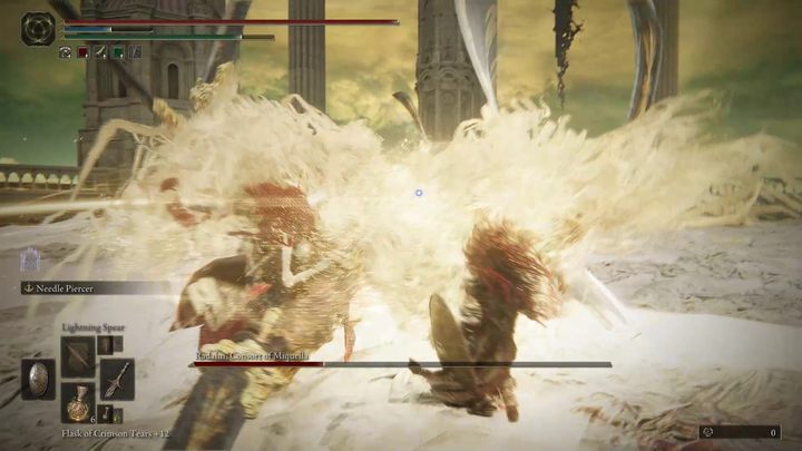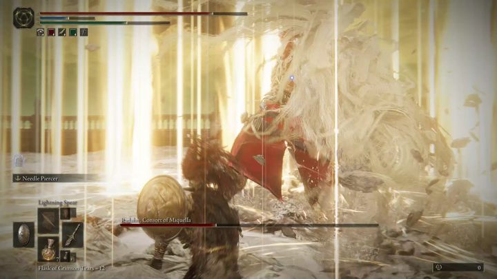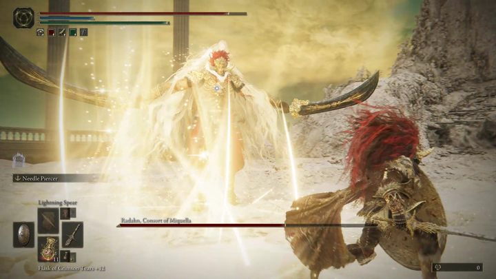 - In the second phase, Miquella joins the fight - almost all of the boss's attacks are now accompanied by pillars of light falling from the sky. Stay just in front of Radahn - the light hitboxes usually won't reach you there.