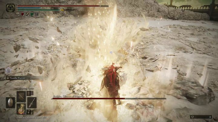 The ground-slam combo becomes much more dangerous in the second phase, because taking out the swords from the ground is accompanied not only by an earthquake, but also by a huge explosion of light. Avoid the combination as you did in the first phase by getting behind Radahn's back - but you need to dodge one more time behind his back to avoid the explosion.