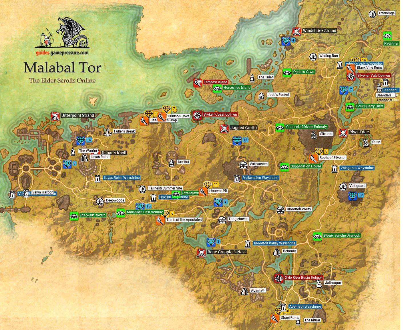 Malabal Tor is a region in the Aldmeri Dominion faction, located to the North-East of the Valenwood province. Malabal Tor is covered with elven forests. The main city in Malabal Tor jest Vulkwasten, ruled by Queen Ayrenn. The main dungeon in this location is the group dungeon, Tempest Island, where hurricanes and storms wreak havoc. The main cities are Baandari Trading Post and Velyn Harbor. The characters that you encounter in Malabal Tor are, among others, Aretille, Lilanion and Munamur. This highly forested area is designed for the players in Aldmeri Dominion faction, with levels between 31 to 38. Below, you can find a complete list of locations, that you are going to visit, as well as Skyshards to find. Also, you can find here a list of bosses, quest markers and rare fishes available to catch.