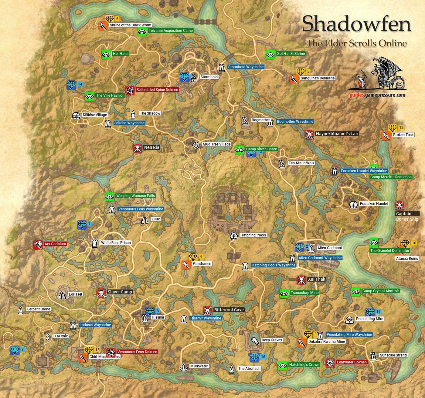 Shadowfen is a region in Black Marsh, which is the South-most location in the Ebonheart Pact faction. It directly borders Morrowind. The prevalent climate are marshes and forests. Shadowfen has its history, when the imperials enslaved the Dunmer people for a long time. Due to its climate, there is dominated by the culture and population of Argonians. The main city in Shadowfen is Stormhold. The Shadowfen region is designed for players at the experience levels between 24-32. The below list names all of the locations for exploration and skyshards. Also, you can find here a list of rare fishes that you can catch here, and caves to explore. Quest Markers will help you with general navigation, and boss locations in group sojourns.
