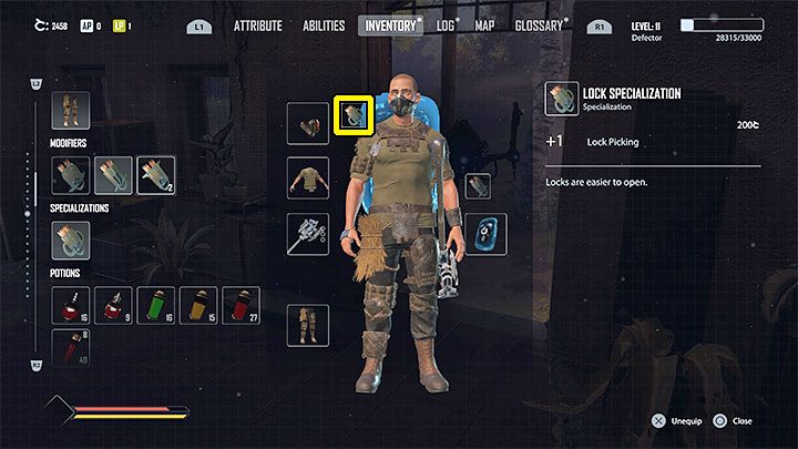 Specializations offer various bonuses to skills - the one from the picture above is able to increase the Lockpick skill by 1 level. Specializations are great if Jax's attributes aren't high enough to unlock or purchase the next level of the skill you are interested in yet.