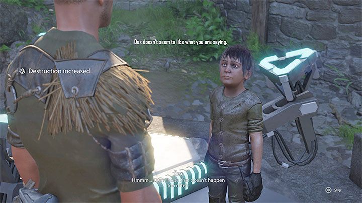 Commentary: We've covered destruction in more detail on a separate page Destruction meter and talking to characters. To get this achievement you must make decisions and select dialogue options which reduce your destruction meter. The game always notifies you when your destruction meter changes, so if you made a mistake you can reload the game and choose different options.