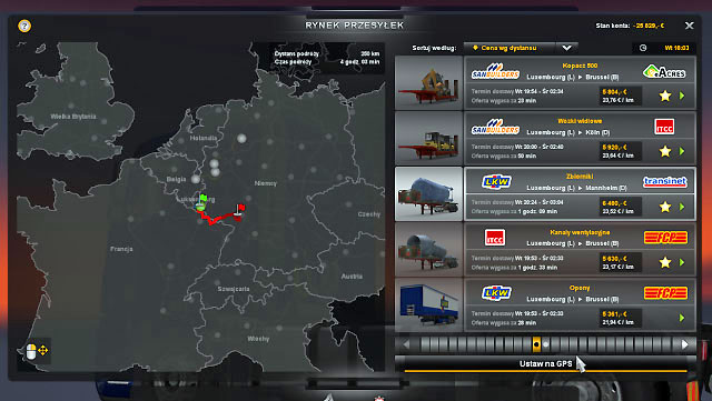 The consignment market is similar to quick orders, but now you have your own truck. When you select an order pay attention to mileage price (unless you want to explore another city or check a new route). But when you accept the consignment order you have to get to the loading location. Although you may see orders from the whole Europe it is wisely to pick up orders from the city you are already in. You may take into consideration nearby cities as well. Each order shows remaining time before it expires.
