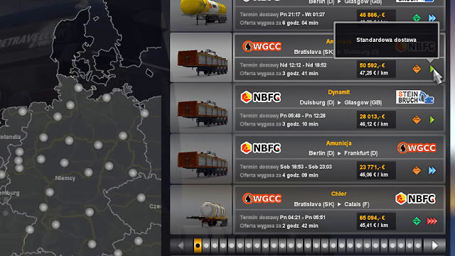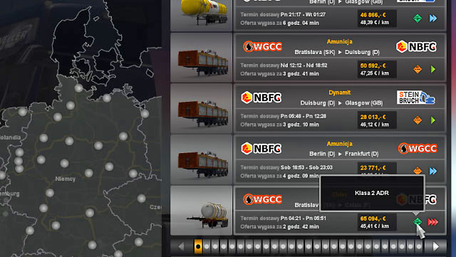 Use skill points to unlock the given ADR class to receive such orders. To have access to all hazardous goods, you need to spend six points. The ADR goods are marked with a special sign on the order list (six icons, each class has a different one).