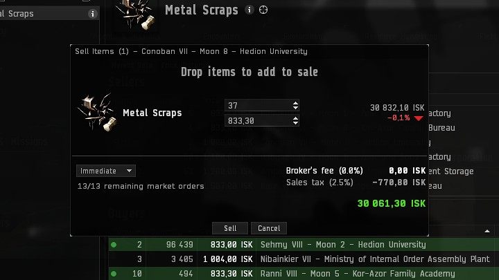You will be automatically transferred to the item sales window, where you will be able to choose the number of items you want to sell immediately (if there is a good buyer) or put them on the market for a certain amount of ISK.