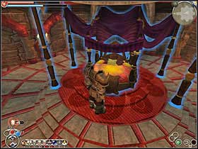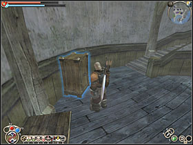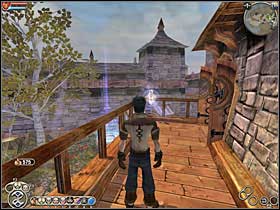 Enter the tailor's shop and go upstairs, the key is on the balcony.