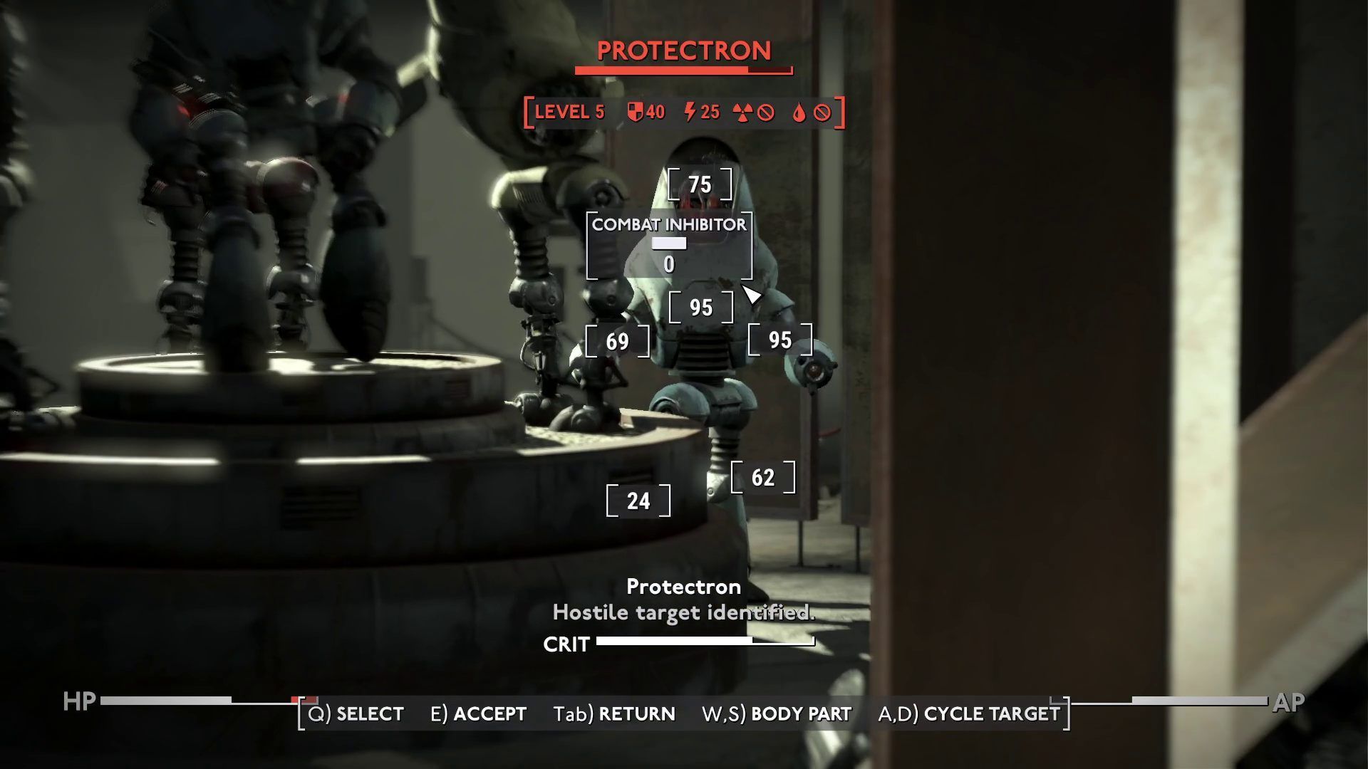 On the first floor, you will encounter a legendary enemy: the Angel's Protectron. It is quite durable and its laser deals quite a bit of damage. Hide behind covers and try to outmaneuver the slow enemy.