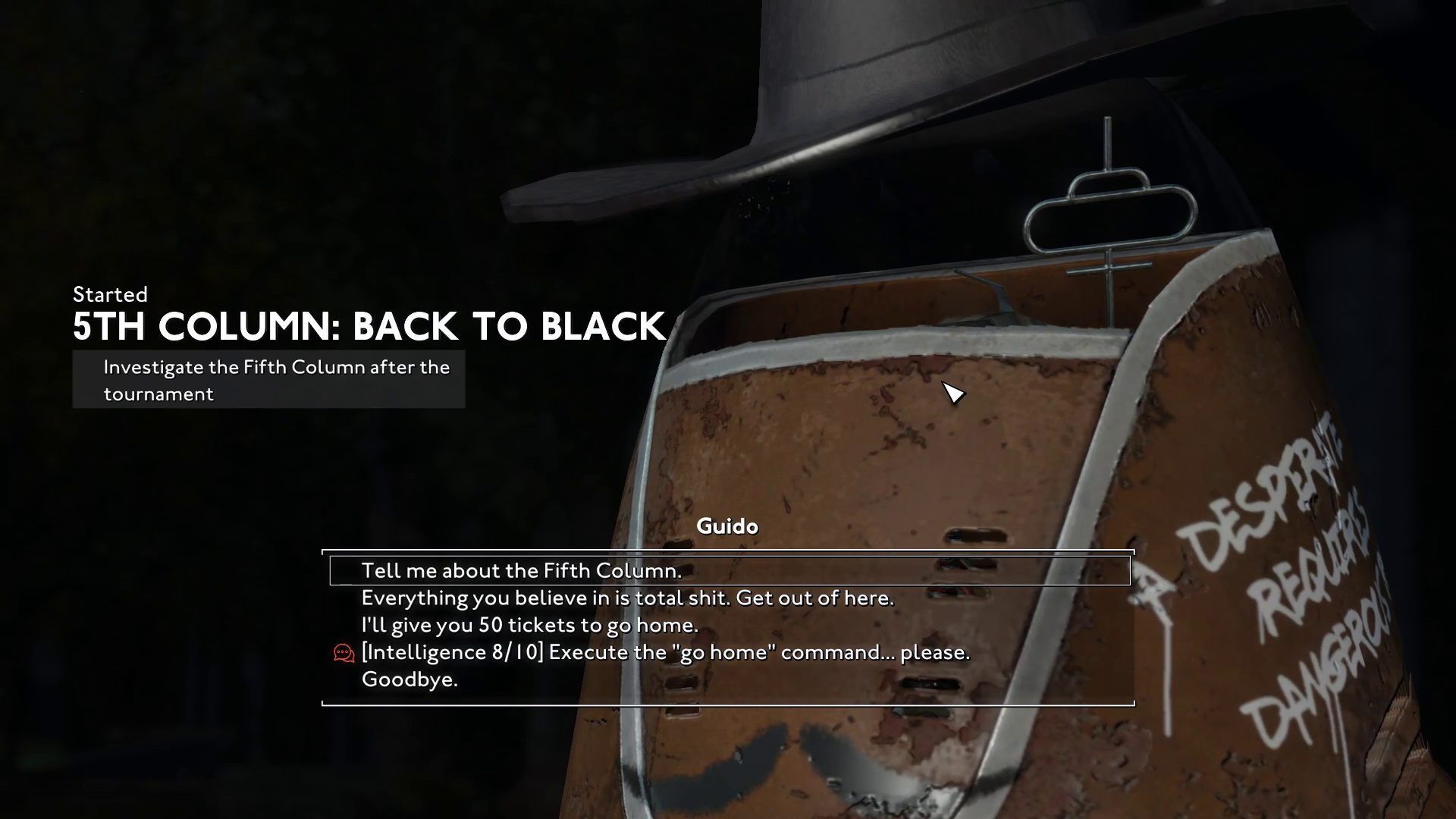 During your conversation with the robot, you will also initiate the Back to Black mission. Later on, you can complete it to start the Fifth Column storyline.