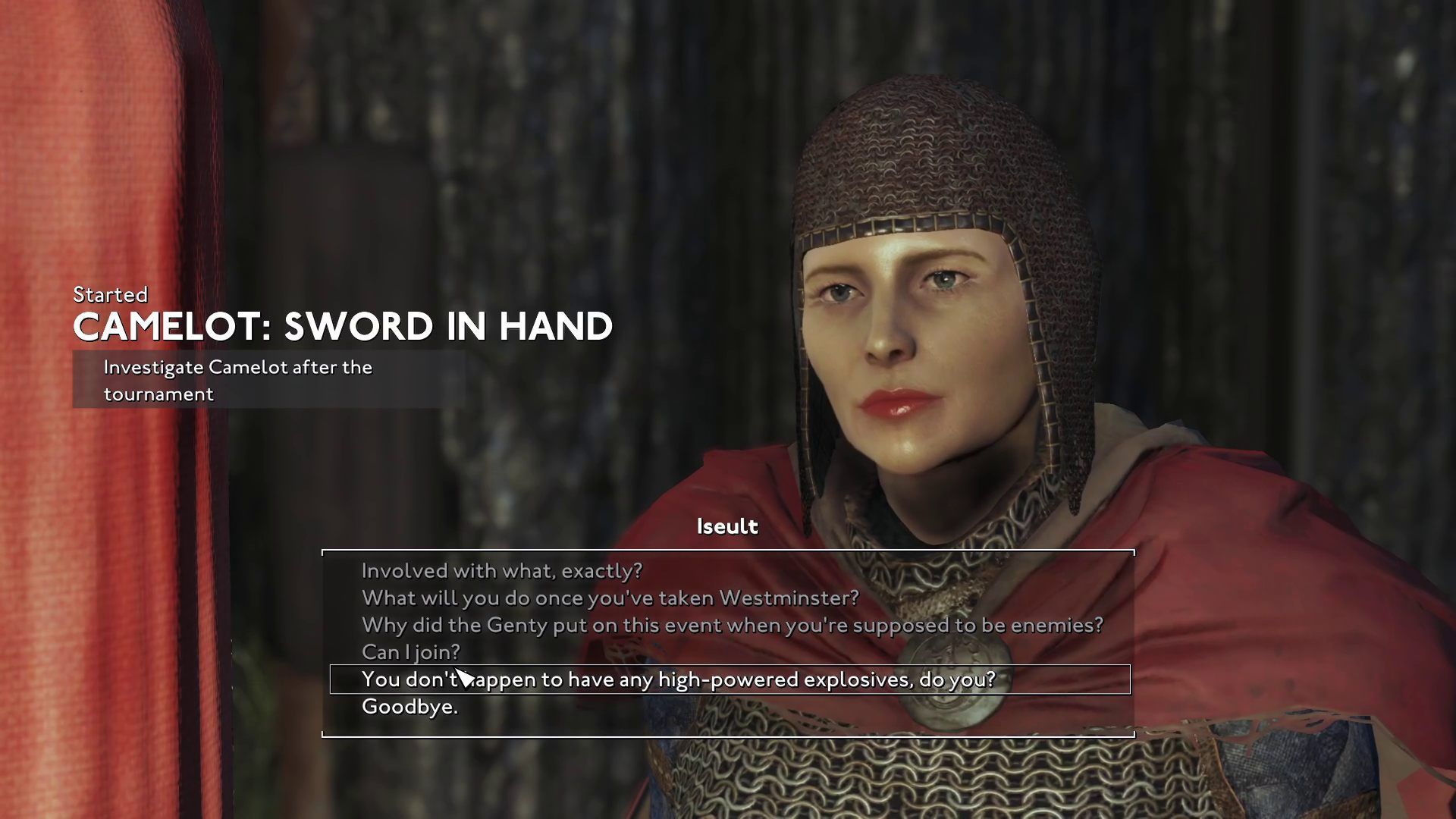 Upon entering the tournament grounds, turn left from the entrance and talk to the knights dressed in armor. From a short conversation, you will learn that they represent the Camelot faction, striving to bring democracy to London. Similarly to the Fifth Column mission, here you will receive a quest related to the Camelot faction.