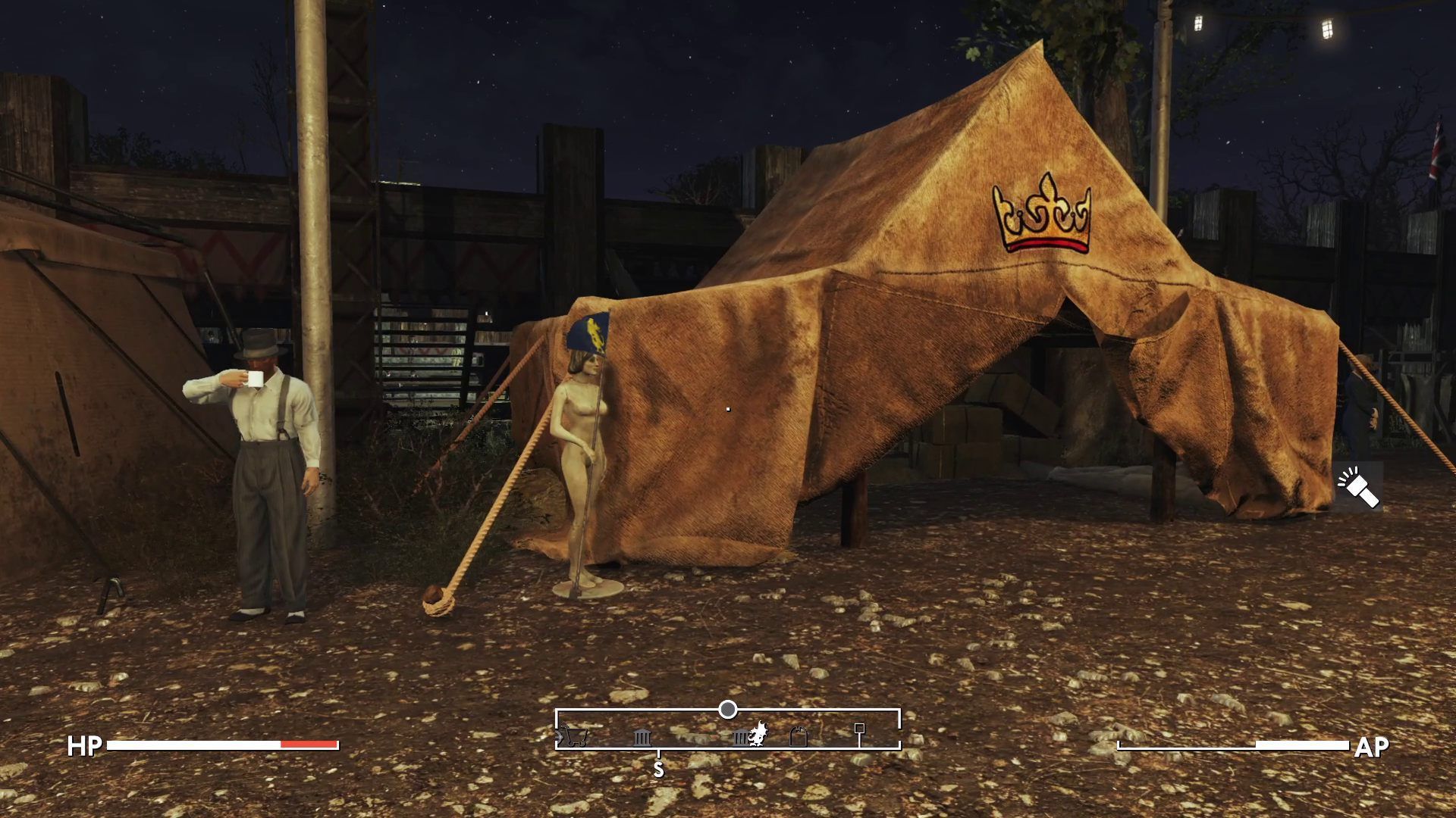 To find the explosive, head to the opposite end of the festival and enter the tent marked with a crown symbol. The bomb is in the cabinet on the left. Take it with you.