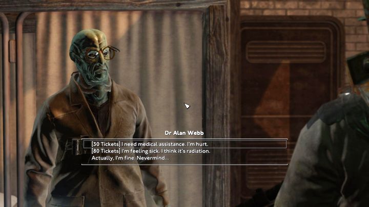 Additional hint: Dr. Alan Webb can cure you - restoring the health bar costs 30 Tickets, and removing radiation is 80 Tickets.