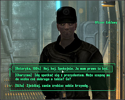 I guess you might be a little surprised by the fact that Eden has ordered Autumn to release you. The first thing you need to do is to reacquire your equipment. Open the nearest locker, put on your armor and reassign shortcut keys to your favorite weapons. Once this is done you may try leaving the room, however you're going to be stopped by one of Enclave officers. There are many different ways for you to deal with this problem. The easiest ways to get rid of him are to be charismatic, threaten him with brutal force or win a speech challenge (screen). If all of this fails you can kill him with one of your primary weapons or you can bribe him and in exchange he'll leave you alone. Aside from the outcome you should remain where you are for a little while. Wait for Eden to give an order by radio to all Enclave troops that they should leave you alone. You could engage Enclave soldiers right away, but as you see it's not necessary at the moment.
