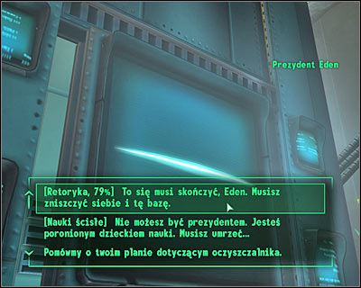 You will be given an opportunity to talk to president Eden who is an... intelligent machine! This conversation can go many different ways depending on the answers you'll decide to choose. First of all, you can convince Eden to self-destruct (screen). You can achieve a similar effect if you choose answers based on your high intelligence. Eventually Eden will make an error and won't be able to give you a straight answer. Alternatively you can agree to his proposal and for him to continue functioning in that from. Even if you plan on staying on the good side you should listen to his plan to eliminate all beings with traces of mutation in their bodies.