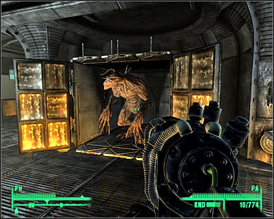 Notice that a large vial of FEV virus has been ejected from the computer. Pick it up even if you don't want to cooperate with the Enclave. Don't worry, because you'll make your final decisions when the time is right. For now you must focus on leaving Raven Rock in one piece. Choose a nearby hatch to get to Raven Rock - level 1. Just as before, large groups of Enclave soldiers will stand in your way. The good news is that you'll have robots and defense turrets on your side, so it should make these fights a little easier. Be on a look out for a shipping container along the way. You can hack into one of the terminals to open the container. There's a deathclaw inside the container (screen) and the creature will help you in getting rid of enemy units. Keep heading towards section 1B and finally you must proceed to 1A. Don't forget to deactivate a new force field along the way, because this will allow you to inspect several other Enclave crates. It's very important, because one of the crates contains a powerful Gatling laser. As for the enemies, watch out for the final Enclave soldier. He's carrying a rocket launcher, so he should be considered a serious threat. Keep going forward until you can travel to Capitol Wasteland.