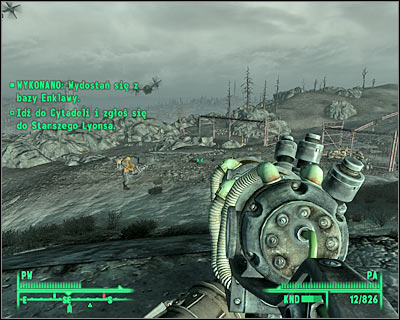 If you rescued supermutant Fawkes during the previous main quest, you will now notice him shooting at Enclave soldiers in front of the Raven Rock facility (screen). I'm sure that you'll be thrilled to see him, especially since he'll eliminate most of the targets for you. Also, if you're playing as a good character he can start travelling with you as your new teammate. I'd strongly recommend that you agree to his proposal. Not only is she powerful and strong, but he also carries a Gatling laser. As for Raven Rock itself, move back to a safe distance if you ordered Eden to self-destruct, because a large explosion will take place here. You will also have to avoid vertibirds, but the pilots should be focused on other activities.