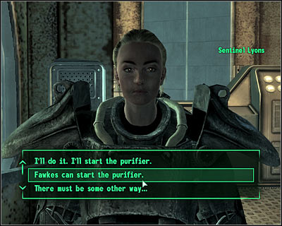 - In the main game you had to make a choice between you and Sara, because you couldn't ask any of your teammates for help. This has now changed. I would recommend asking Fawkes to start the purifier [#2], because he won't suffer negative effects of the radiation.