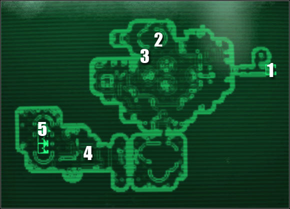 Map legend: 1 - passageway to: Experimentation Lab; 2 - recording; 3 - healing archway; 4 - supplies; 5 - teleportation matrix to: Death Ray Hub