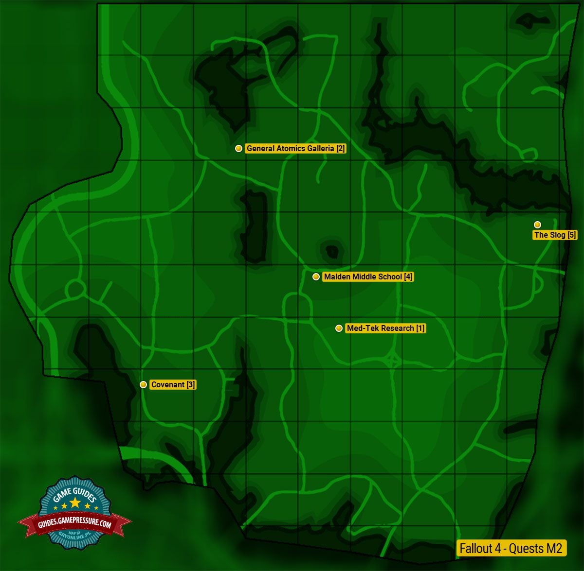 The above M2 map shows the second sector of the world map in Fallout 4. It's the northern part of the game world in which you will find, among other places, the city of Malden. Yellow dots on the map mark locations in which you can start some quest (main, side or faction one). Red dots symbolize other locations. You will not unlock any quests there, but they might be related to quests started in other parts of the game world.