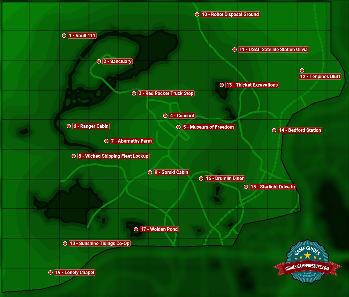 The map seen above shows the first sector of the world map which is its north-western part. The map has icons of locations you can discover while visiting this sector. Each location has its description on the map and more important locations have their separate pages in the atlas with more info. The most important locations in this part of the world are Vault 111 (you will begin your game here), Sanctuary (it'll be your first base) and Concord town (you'll visit it while completing the first main quest).