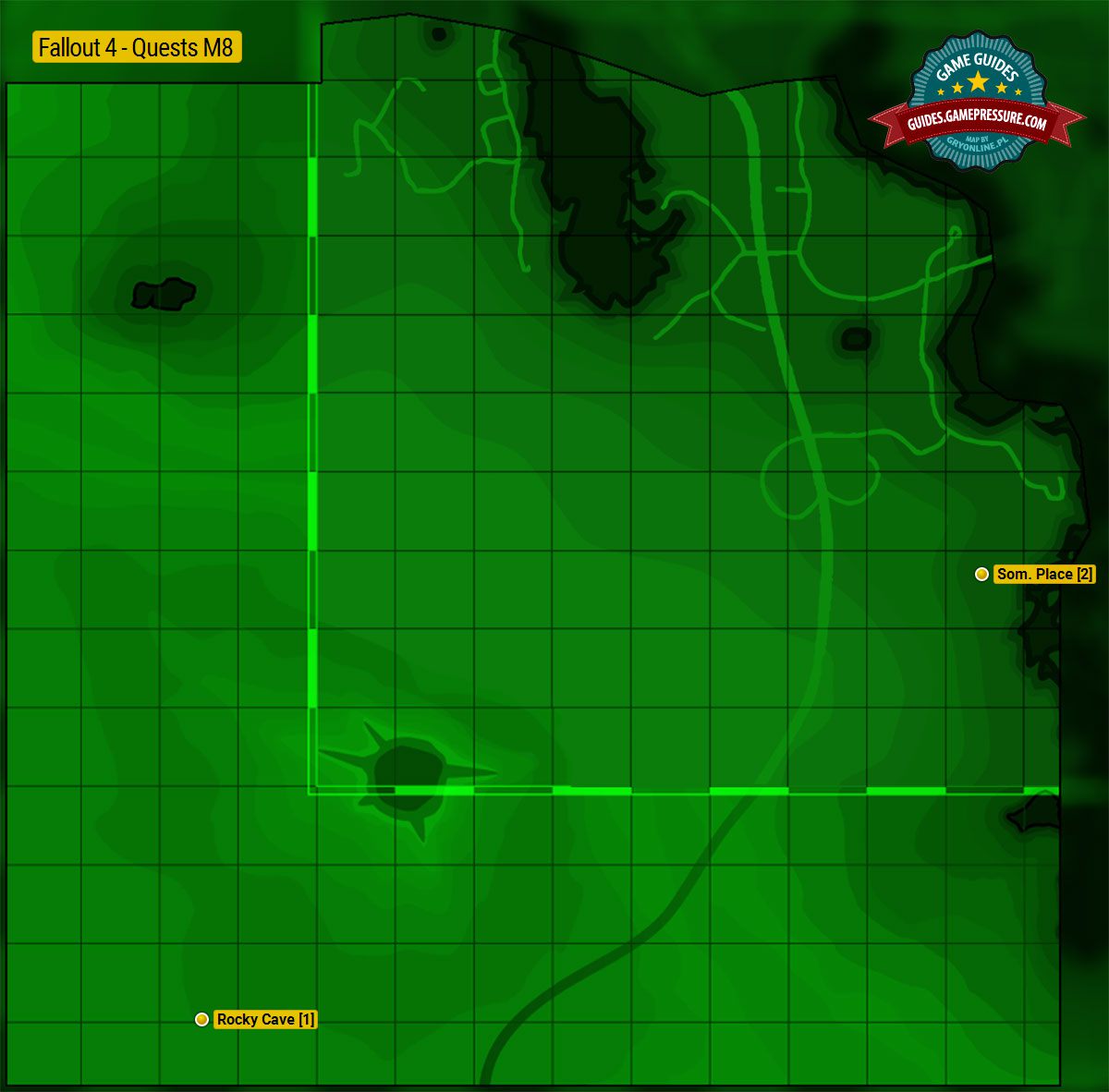 The above M8 map shows the eighth sector of the world map in Fallout 4. It's the southwestern part of the game world which is highly radiating and due to that unavailable during the early phase of the game. Yellow dots on the map mark locations in which you can start some quest (main, side or faction one). Red dots symbolize other locations. You will not unlock any quests there, but they might be related to quests started in other parts of the game world.