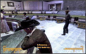 Do not talk neither to Heck nor to Marjorie and go directly to Mortimer (M7C:2) #1. If your reputation with the Strip is high enough [Liked], he will tell you about his problem and will ask for your help. You have to find the man who was supposed to be a victim for a banquet but he escaped and Mortimer has kidnapped son of Heck Gunderson, a very powerful Brahmin Baron, instead. You'll receive Cattle Prod and keys to the Ultra-Luxe freezer, Gourmand kitchen and Ultra-Luxe Penthouse. Go to the kitchen where you'll find a guard: