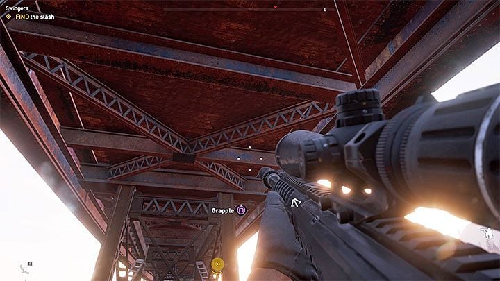 You need Grapple Hook to complete this mission - get the right perk. Head towards the bridge and slide down the rope. Focus on locating new places where you can attach your grapple hook - the first place is presented in the picture 1. Swing on the rope and jump either on another ledge or to reach the next grapple point (press the grapple button again). The picture 2 presents the destination. Jump down on the lower ledge to reach the prepper stash. Here, you can find a bow, a vest, a lot of money, 3 perk books (each one of them gives you 1 perk point) and ammo. Besides that, you will also receive a unique outfit - Deer Season.