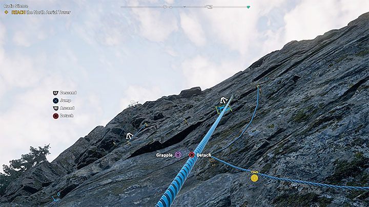 North Aerial Tower is your next objective. You can use fast travel or jump from the southern tower and use either a parachute or the Wingsuit to fly there. Prepare for a long climb on the cliff's wall (the picture above). Use the Grappling Hook to grab on to the hooks.