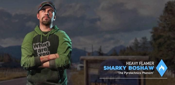After you reach the trailer park, you will notice Sharky playing with his flamethrower. Talk to him and follow him on a storyline Burn, Baby Burn, where you will have to defend against successive waves of enemies. After you deal with all the enemies, Sharky Boshaw will appear on the list of available specialists.