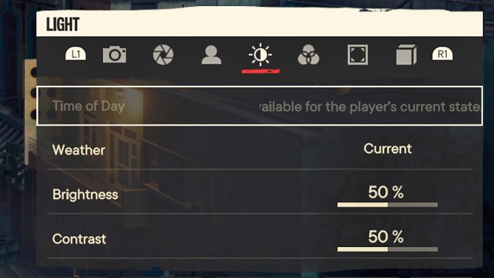 An interesting fact is that you can change the time of day while using the photo mode. To do so, you have to go to the light-related options tab. In the same tab, you can also change the current weather conditions (e.g. rain). The game may not allow you to change this setting if you're completing a mission with a determined time of day.