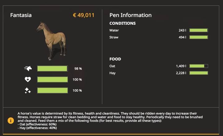 You breed horses to sell them when they gain in value. Feed them regularly, provide them with straw, ride them regularly, and don't forget to brush them, so that may reach a value of up to $50,000 per horse.