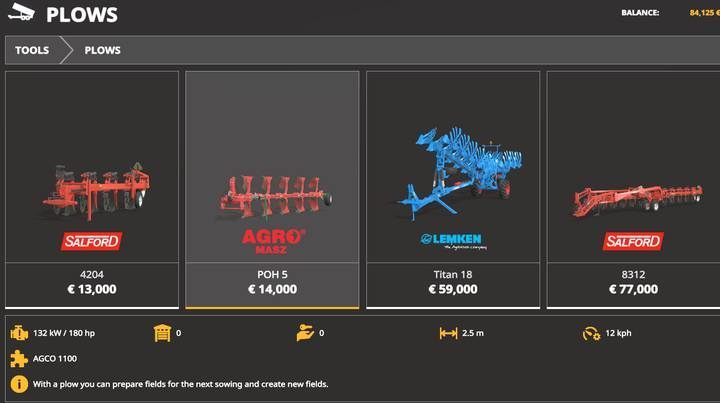The larger the plough, the faster the work is done. At the beginning of the game, you should consider the plough called AGRO POH 5. It is mounted on the tractor so that it is in the air - making it easy to manipulate, twist and turn.