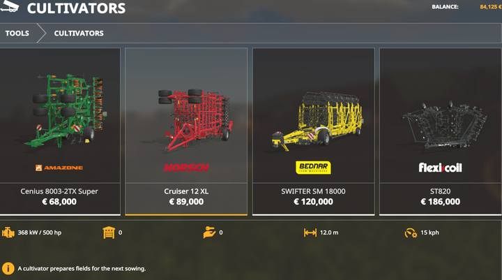 You can find cultivators in several categories as they are often combined with machines that are able to perform other functions as well. We do not recommend most of the machines in the Cultivators tab in the shop: they usually require a lot of power, are single-functional and move at a maximum speed of 15 km/h.