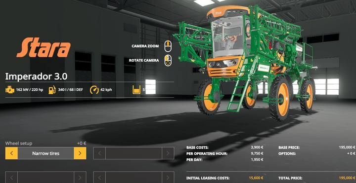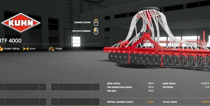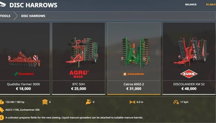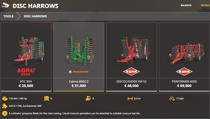 Harrows work exactly the same way as cultivators. As a rule, however, they do not have seed drills or fertilizer sprayers, but they often have lower requirements for tractor power and quite a low price and higher working speed than the machines in the Cultivators tab (harrows work at a speed of 17 km/h, cultivators - 15 km/h).