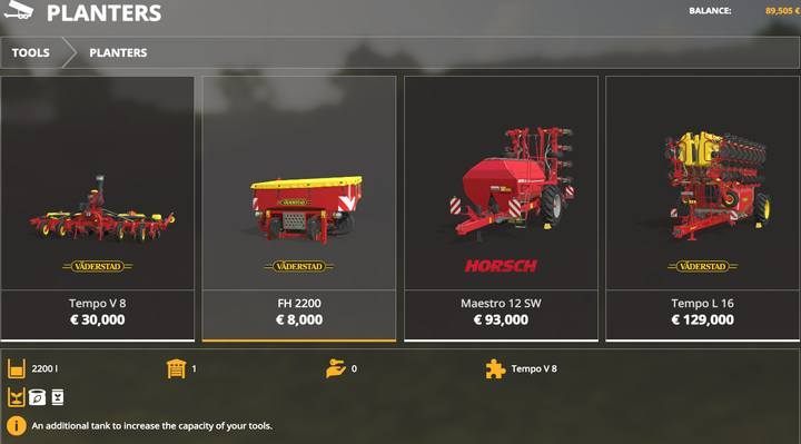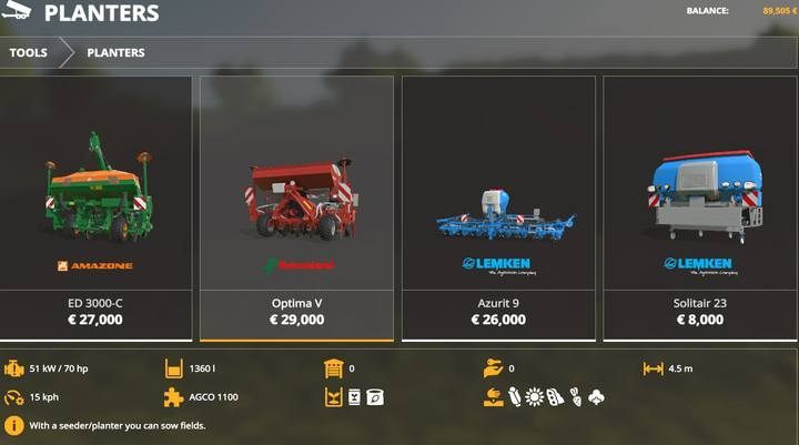 If you want to grow other plants that are not allowed by the seeder, you have to use a different tool. A Planter can only work on ploughed or cultivated fields. For some plants, special planters are required. The basic planters will allow you to plant: sugar beet, corn, sunflower, cotton, and soy. Fill the tool from the seed pallet purchased in the shop before use.